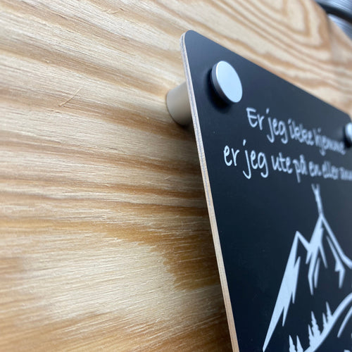 Med teksten: Er jeg ikke hjemme så er jeg på en eller annen topptur