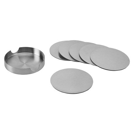 Stilren design i børstet, rustfritt stål. De runde brikkene er 10 cm i diameter.