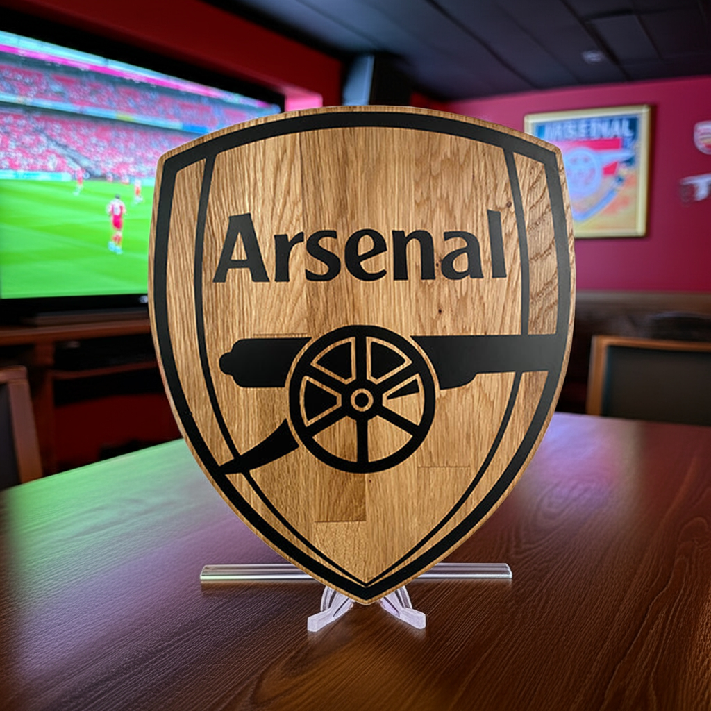 Vis din lidenskap for Asenal med dette unike veggskiltet – laget i solid, stavlimt eik som blir gravert før det fylles med svart epoxy. Et personlig og stilfullt innslag til hjemmet, kontoret eller man cave-en.